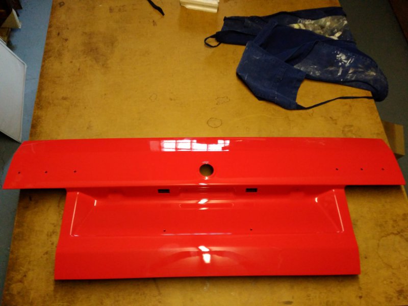 so ... nach vielen Jahren endlich die richtige Heckklappe mit den alten Bohrungen für die Embleme in rostfrei bekommen und sofort rot angepinselt