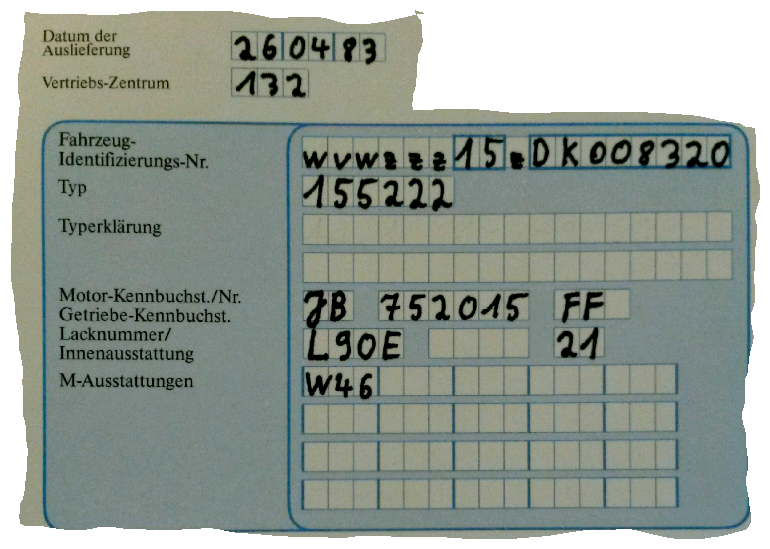 Der Identaufkleber zeigt nur W46. Lt. VW kann anhand der Fahrgestellnummer auch das Sondermodell bestätigt werden. Aber: Ohne weitere Info. Im VW-Archiv ist nur ein leeres Textfeld hinterlegt. Auf das Karmann-Archiv kann leider nicht zugegriffen werden.
