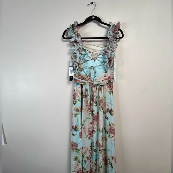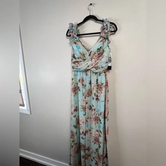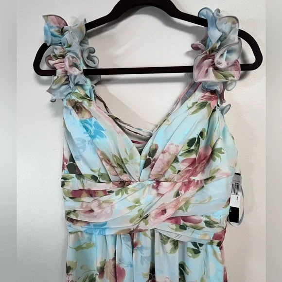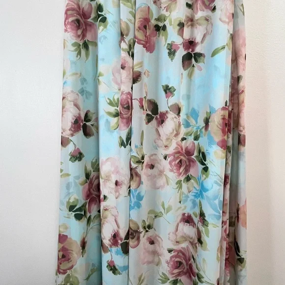 Charming floral maxi dress with a light blue base and pink flowers. Sleeveless design with a flattering fit. Ideal for special occasions. Would make a wedding guest dress for a summer wedding!Runs slightly small, Would fit a 6-8. Top is adjustable but zips at waist (no stretch).feel free to make an offer!